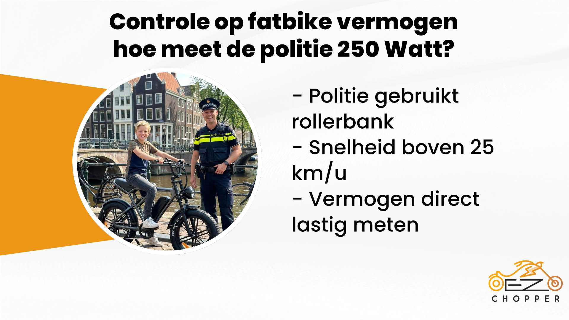 De Nederlandse politie maakt gebruik van de zogenaamde rollerbank om een beeld te krijgen van de fatbike die voor hen staat. Belangrijke aspecten zoals de constructiesnelheid en of de fiets kan rijden zonder dat er getrapt wordt, komen hierbij aan bod. Echter, het direct meten van het exacte vermogen van 250W is langs de weg een stuk lastiger voor hen.