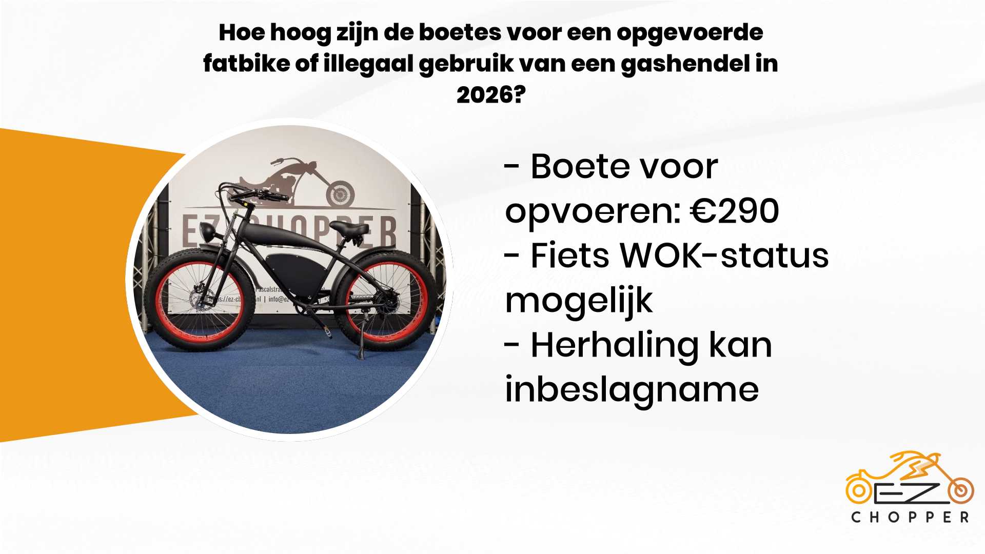 Bij de keuze om je fatbike sneller te maken, moet je rekening houden met mogelijke financiële consequenties. De boete voor het opvoeren van een fatbike of het illegaal gebruik van een gashendel bedraagt maar liefst €290,-. Dat is niet iets wat je makkelijk over het hoofd wilt zien! Betrapt worden betekent bovendien dat je fiets een WOK-status krijgt, oftewel “Wachten Op Keuren”, wat impliceert dat je niet meer mag rijden totdat je fiets is hergekeurd door de RDW. Meer daarover kan je vinden op deze blogpost.