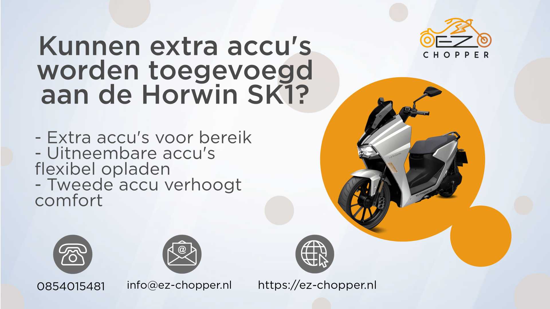 Met de optie om extra accu’s toe te voegen, biedt de Horwin SK1 een flexibele en effectieve manier om je rijervaring te optimaliseren. Of je nu kiest voor een tweede accu van 26Ah of 36Ah, de mogelijkheid om tot 200 km af te leggen zonder te moeten opladen, maakt het leven een stuk makkelijker. Nieuwsgierig geworden? Contacteer ons via https://ez-chopper.nl en ontdek wat de Horwin SK1 voor jou kan betekenen!